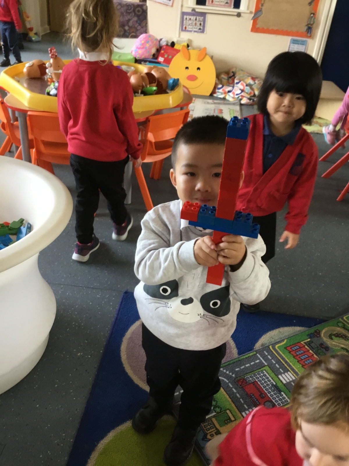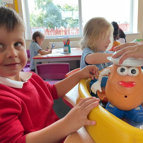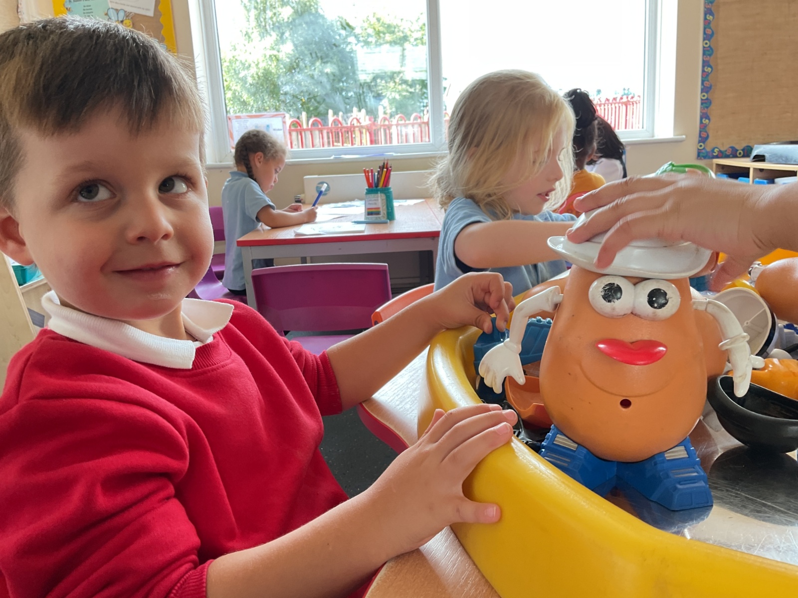 In maths, we have been learning about the colours, red, blue and yellow. We have made pictures and models using these colours. In RE, we have heard how we are all special and that God made us. We drew ourselves and made potato heads talking about our bodies.
