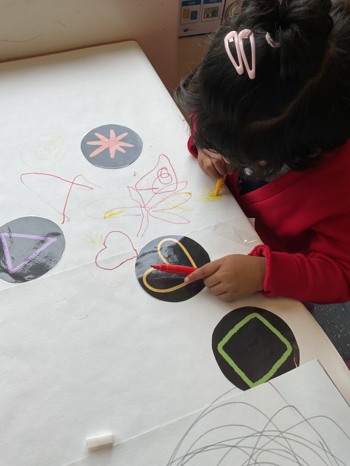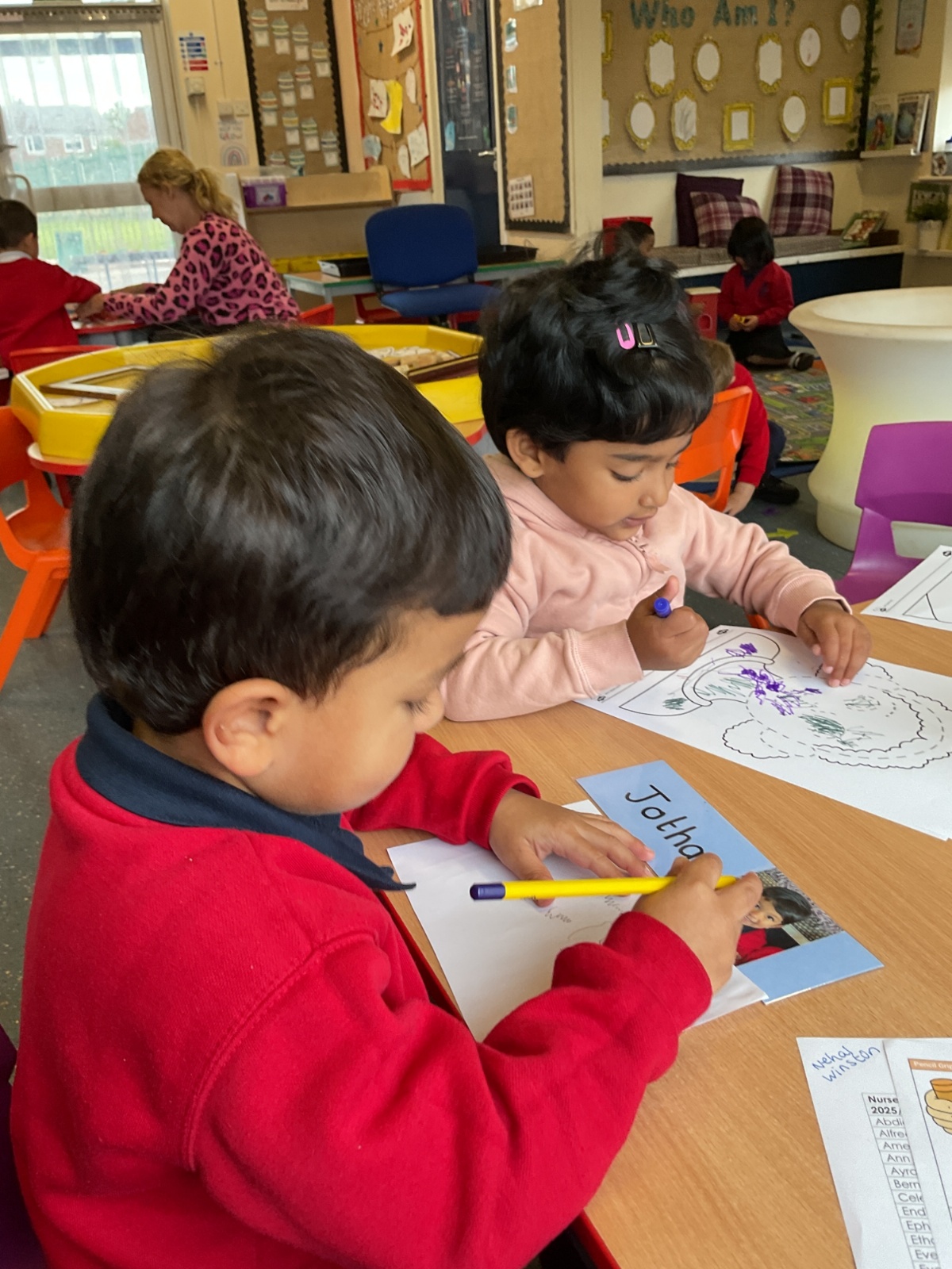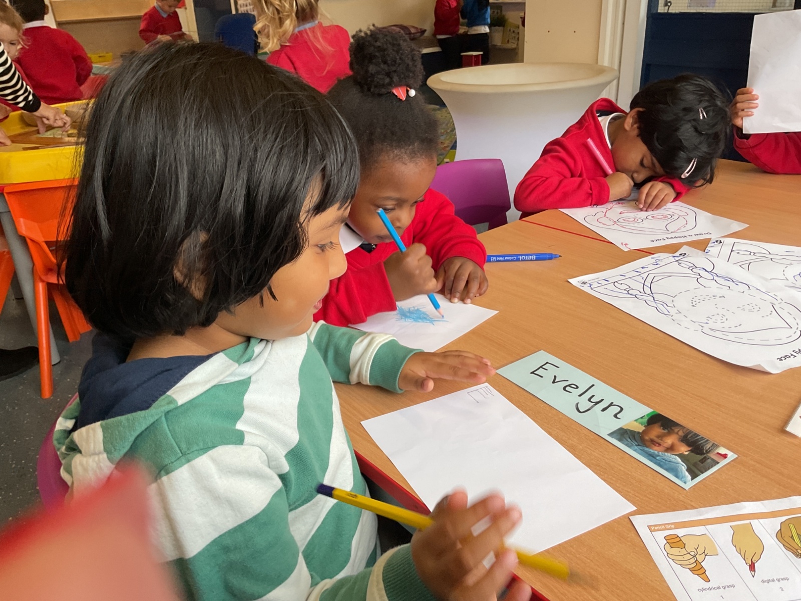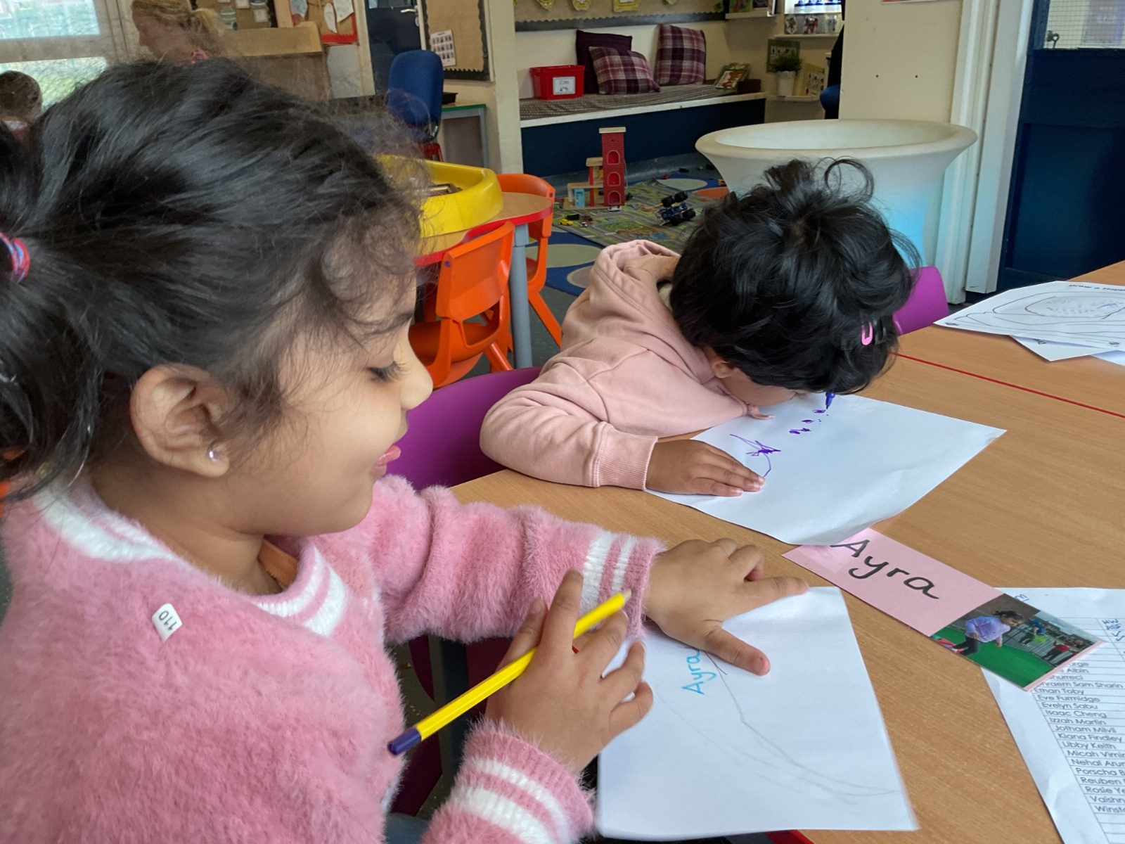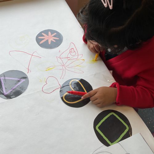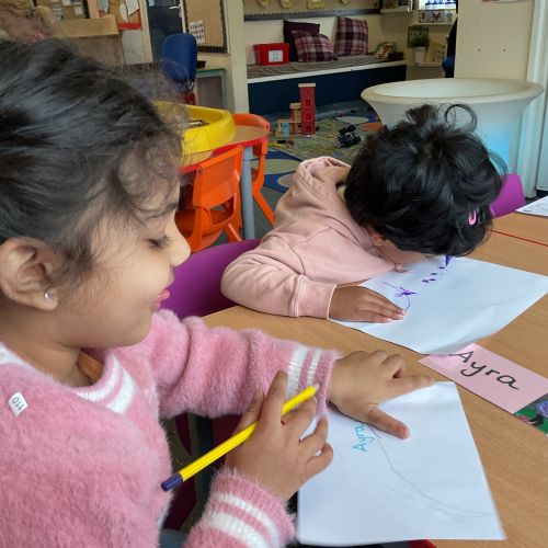 In our literacy sessions, we’ve been exploring mark making. The children have been encouraged to make marks to represent their names, helping to develop early writing skills and name recognition.