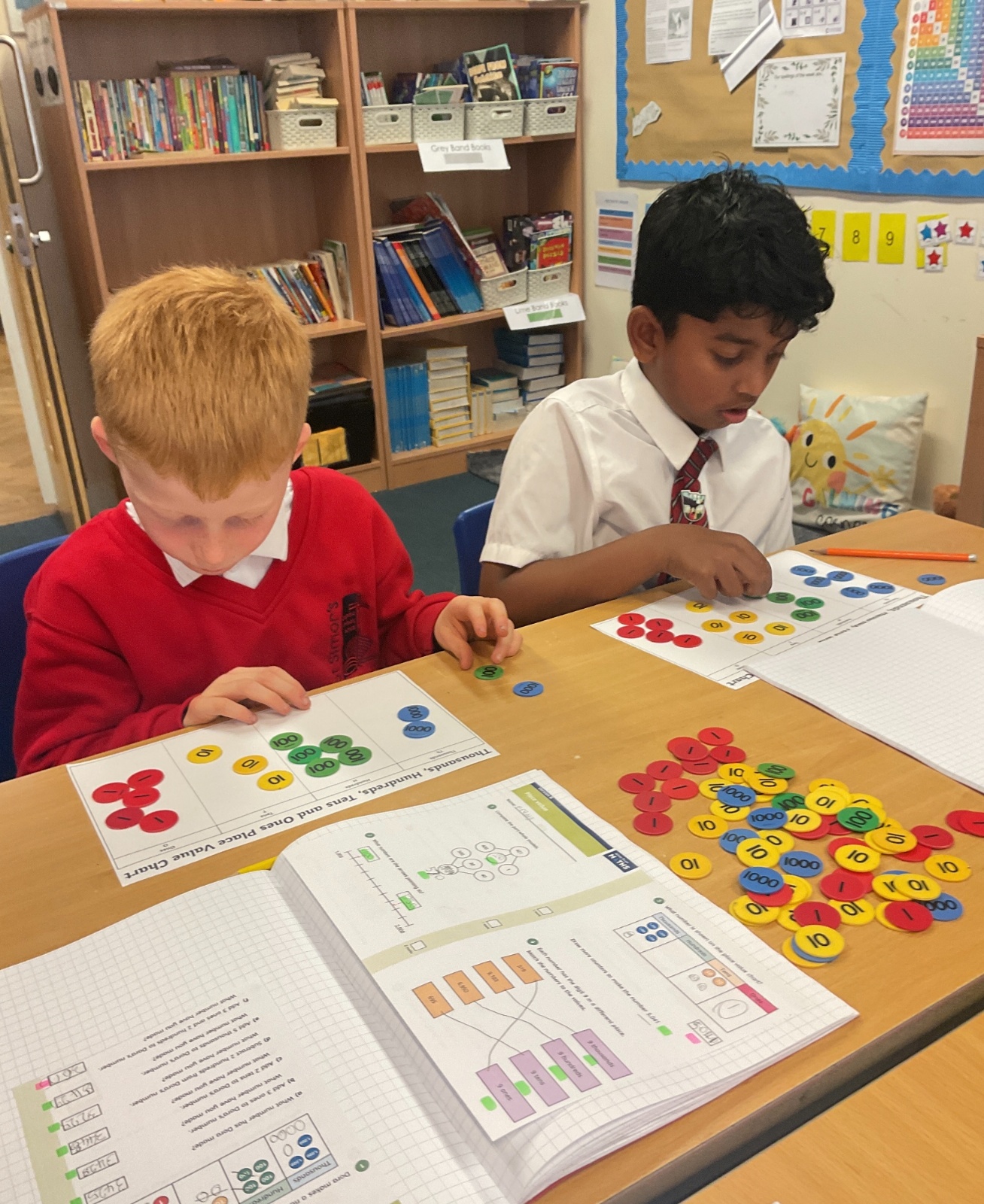 This week, our children have been developing their understanding of number by using place value charts and counters to support their work in addition and subtraction. The place value charts have allowed the children to clearly see the value of each digit in a number — the ones, tens, hundreds, and thousands — and to represent these with place value counters.