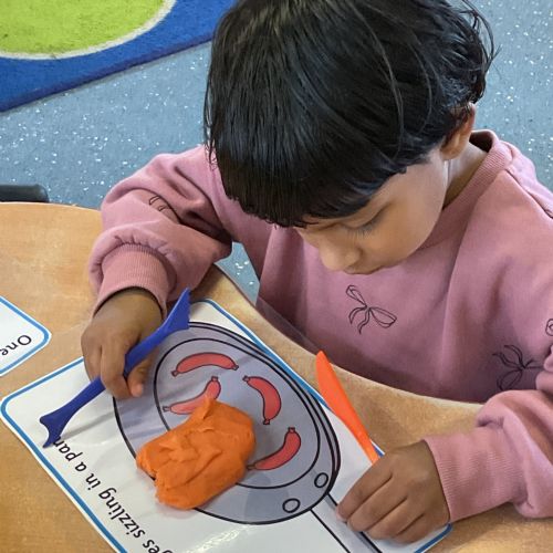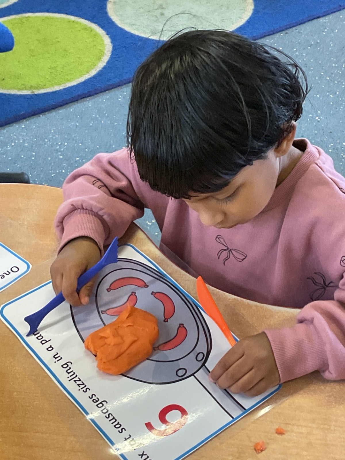 • Our number rhyme this week was "Five Fat Sausages", which helped us with early subtraction skills in a fun and musical way.