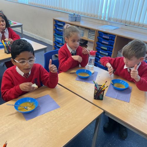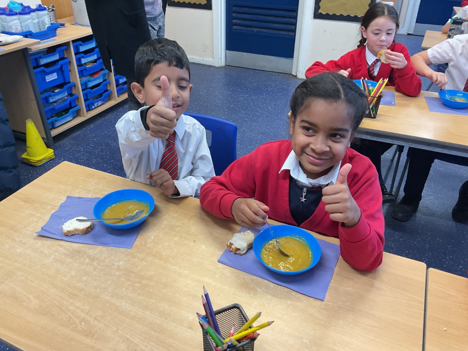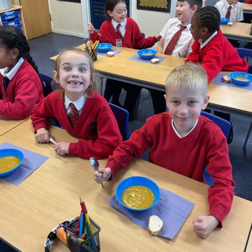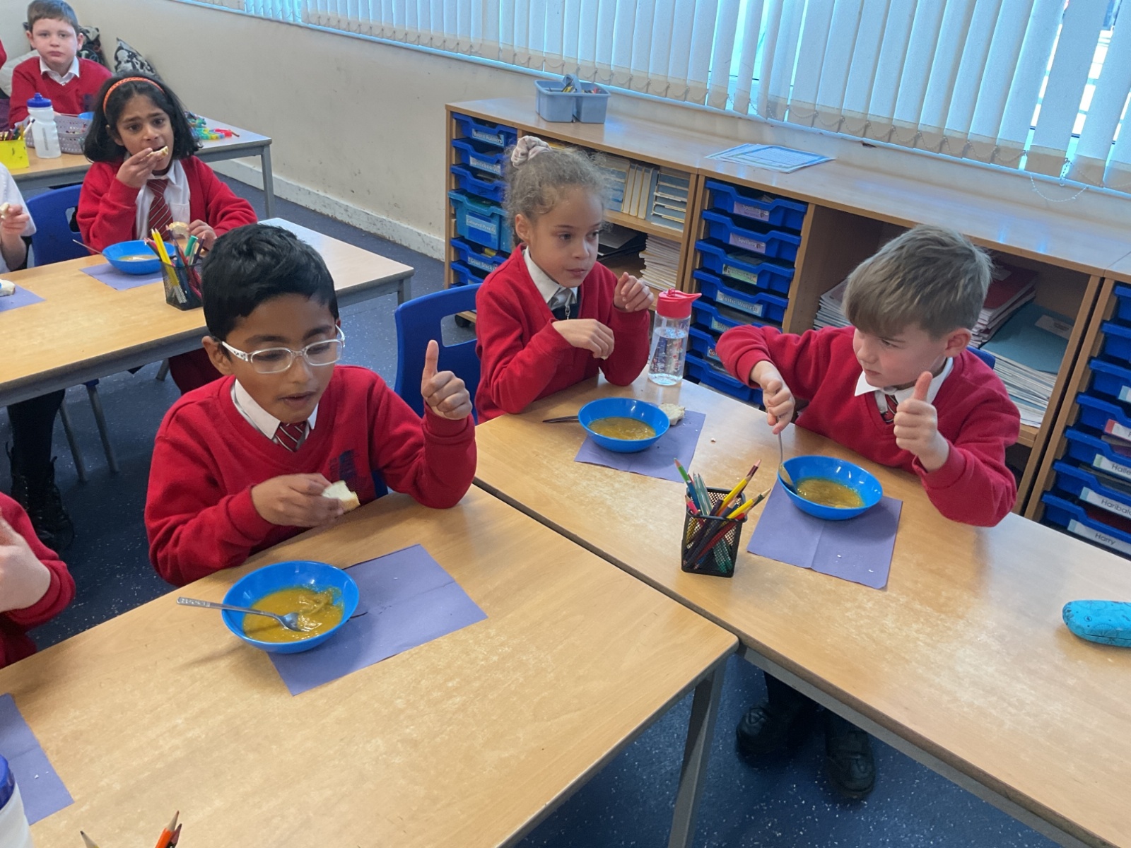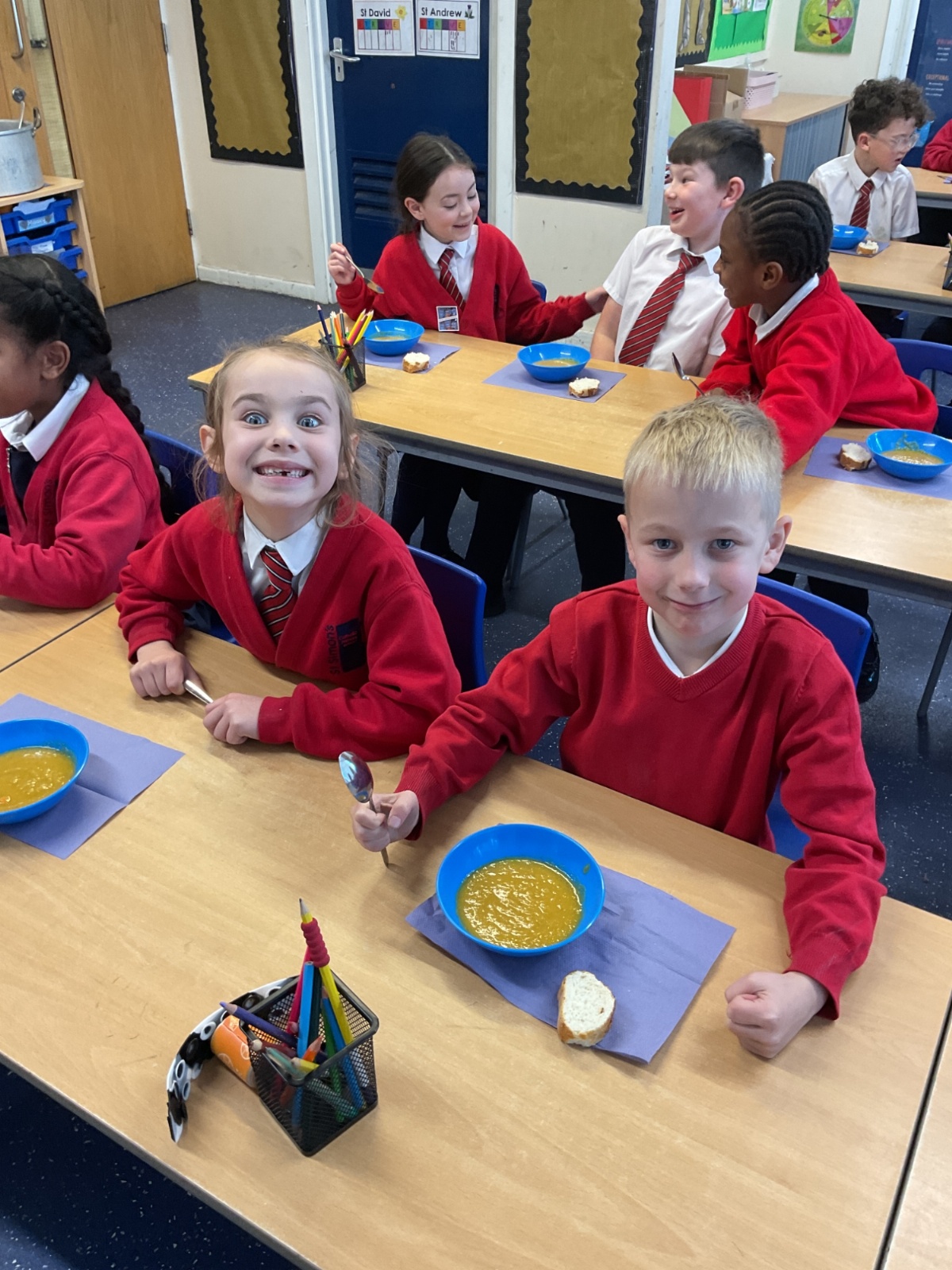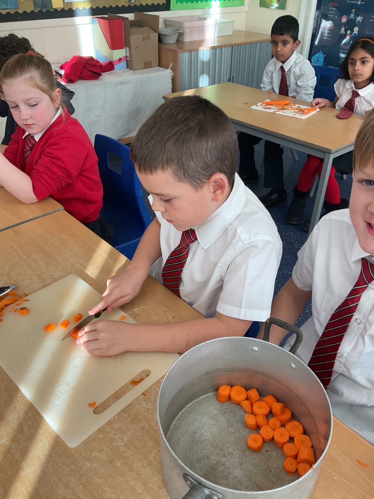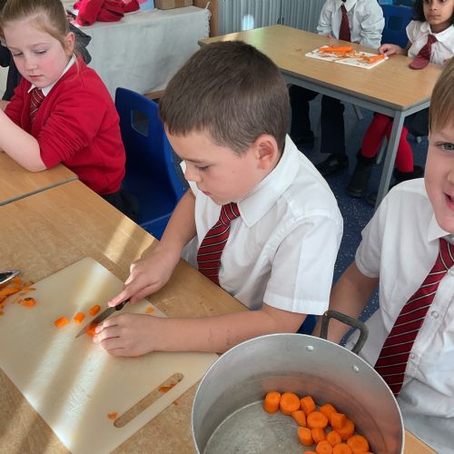 In D&T this week, Year 3 used their plans to use ingredients and tools to make a vegetable soup. The children thoroughly enjoyed working as a team to chop the vegetables. After it had been cooked, the children were excited to sit down together and eat their soup with some crusty bread. Many of the children had extra portions because they enjoyed it so much!