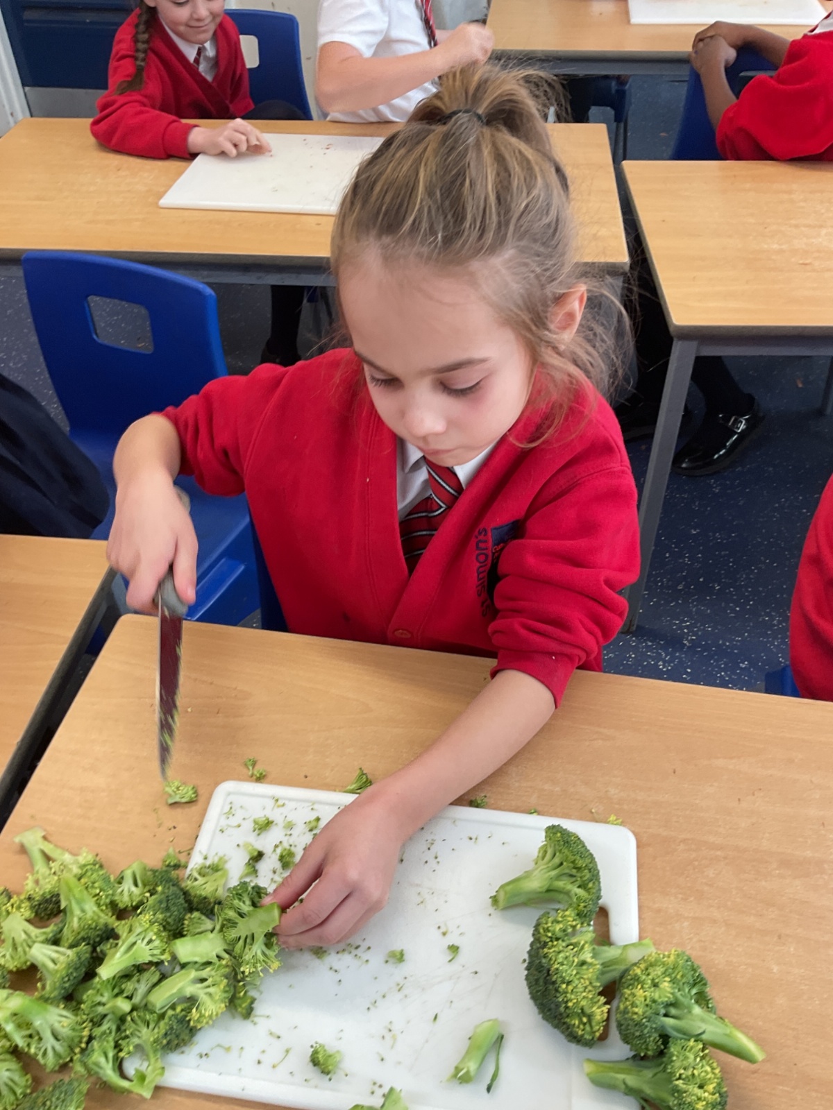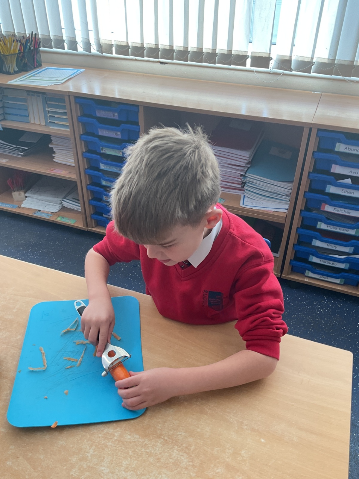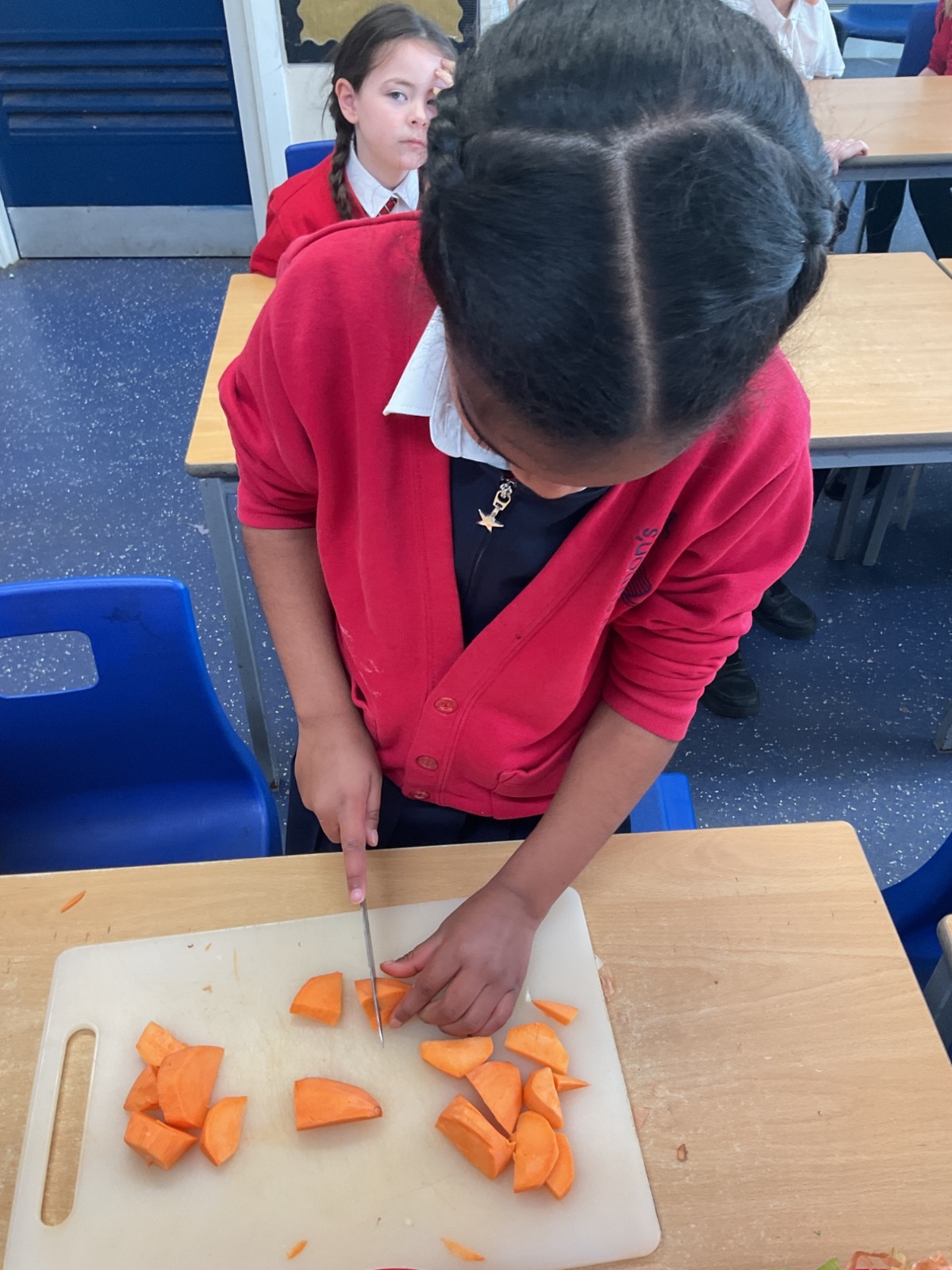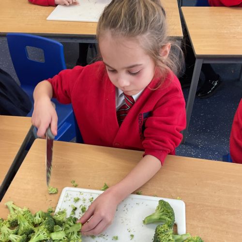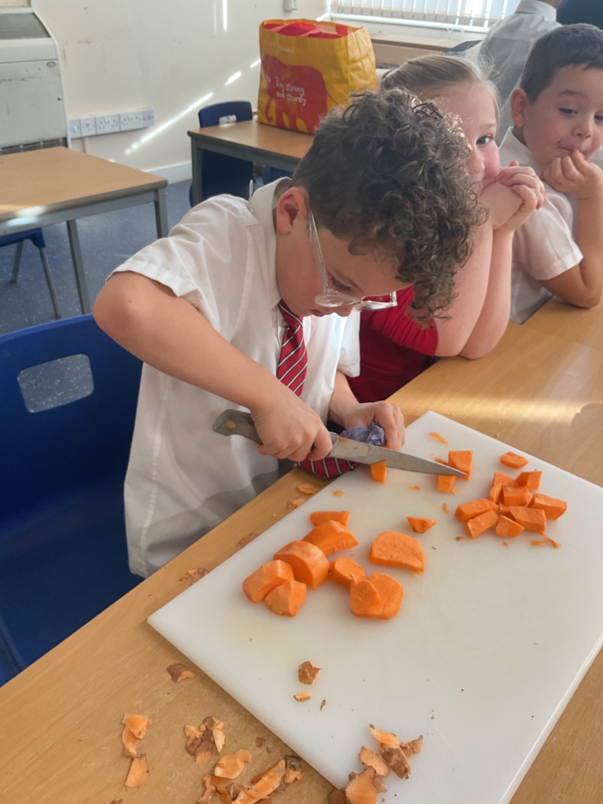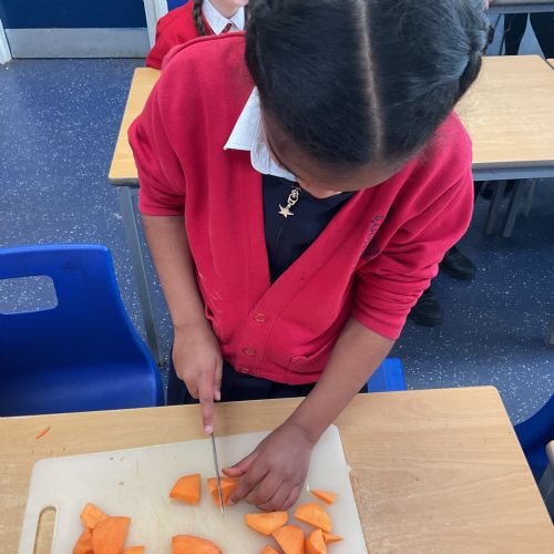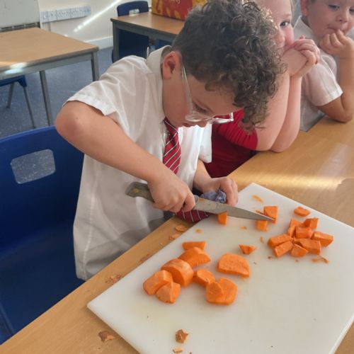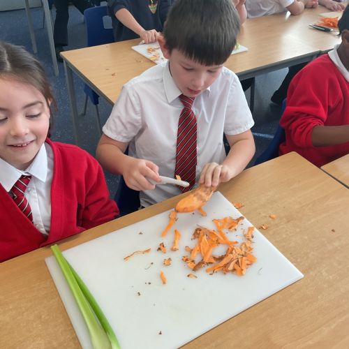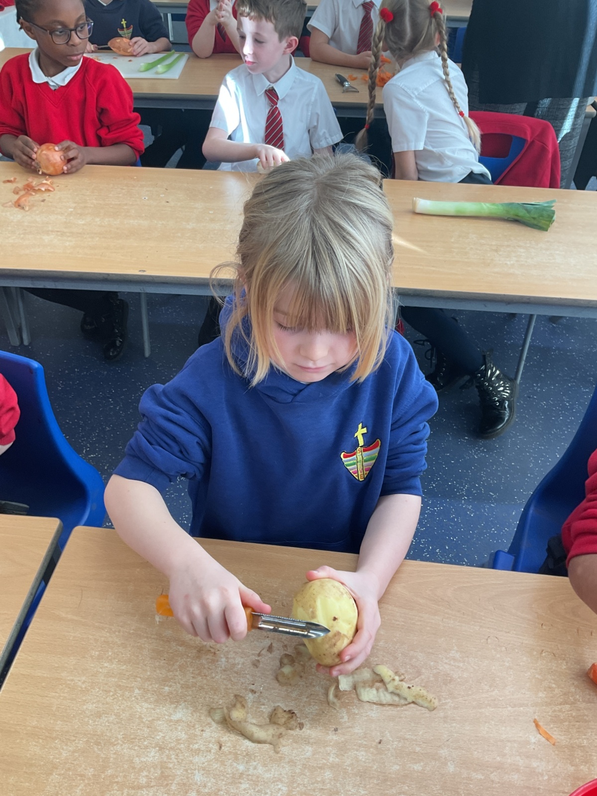 In D&T this week, Year 3 used their plans to use ingredients and tools to make a vegetable soup. The children thoroughly enjoyed working as a team to chop the vegetables. After it had been cooked, the children were excited to sit down together and eat their soup with some crusty bread. Many of the children had extra portions because they enjoyed it so much!