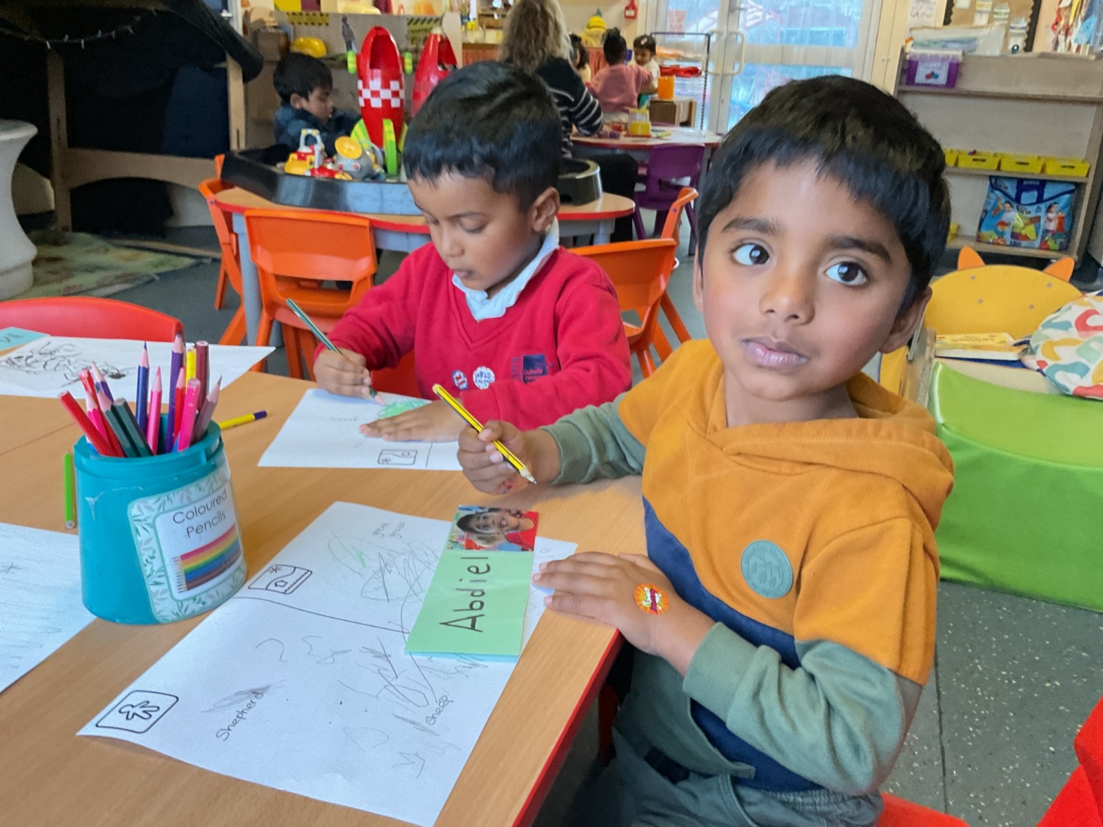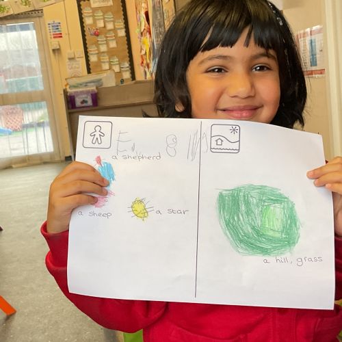 In literacy, we used the tales toolkit, aspects of character and setting, to break down the story. Children drew and talked about the characters (shepherds, angels) and the setting (dark field, bright sky) to build storytelling skills and vocabulary.