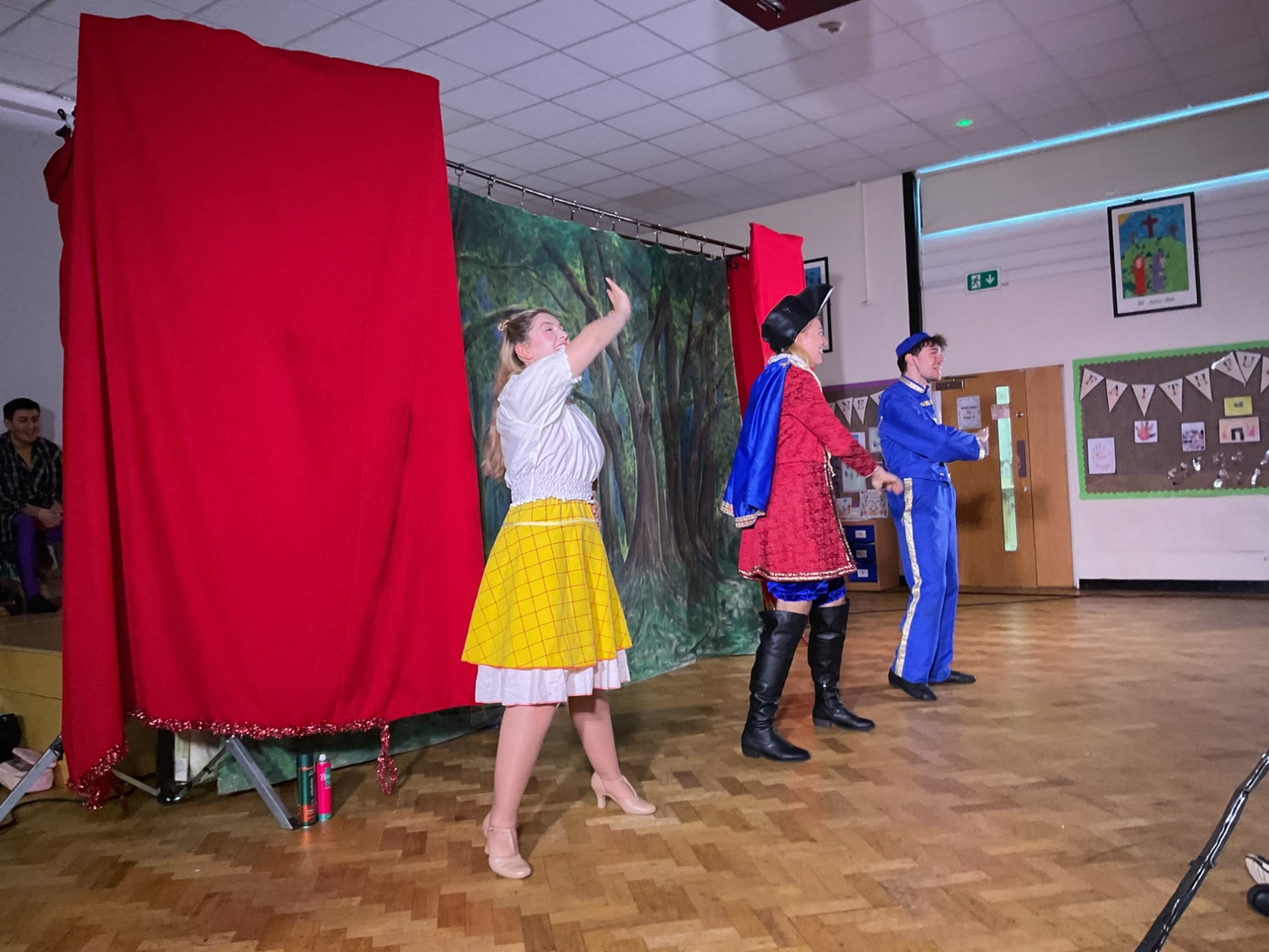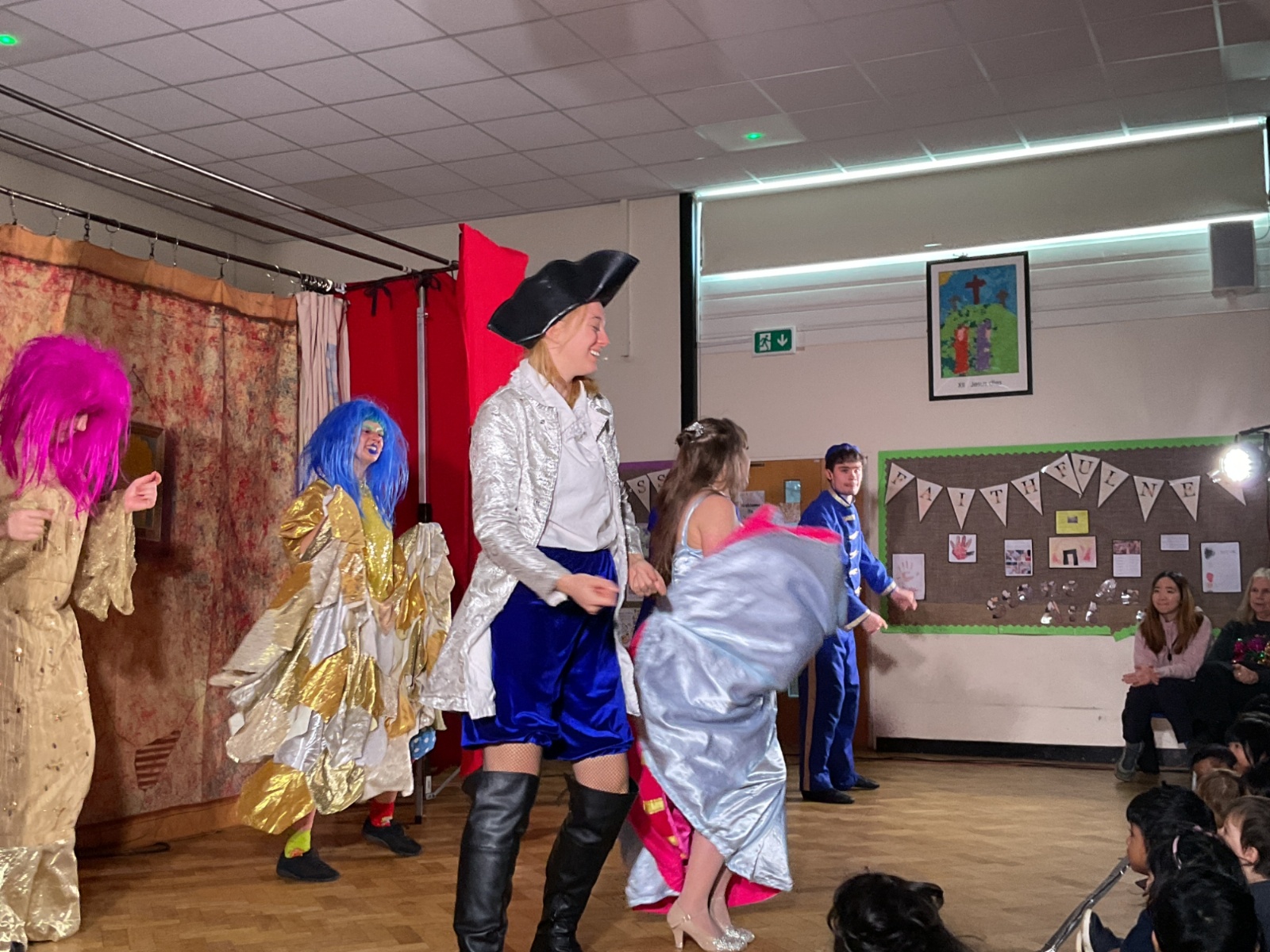 During our party, we played lots of games. For example, Pass the Santa Cap, Build a Snowman and Music Freeze to holiday carols. We watched a production of Cinderella.  The performance featured the lovable Buttons, the Fairy Godmother, and the wicked Ugly Sisters.