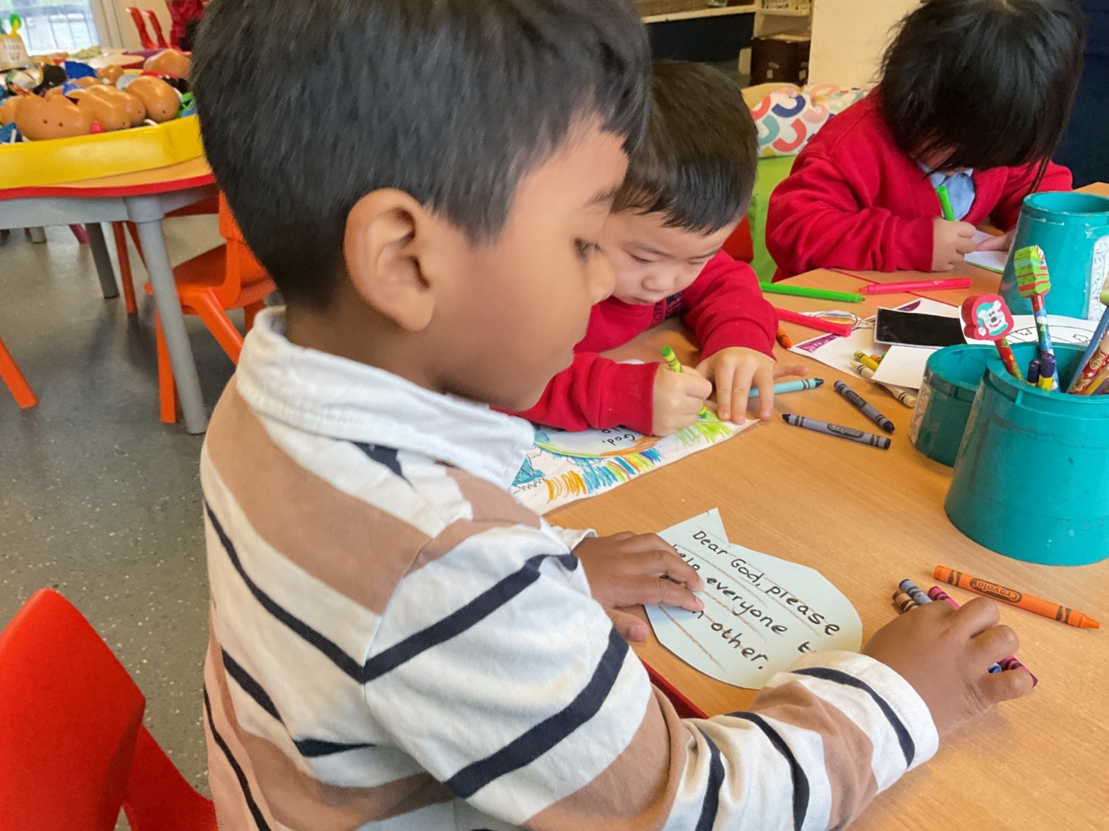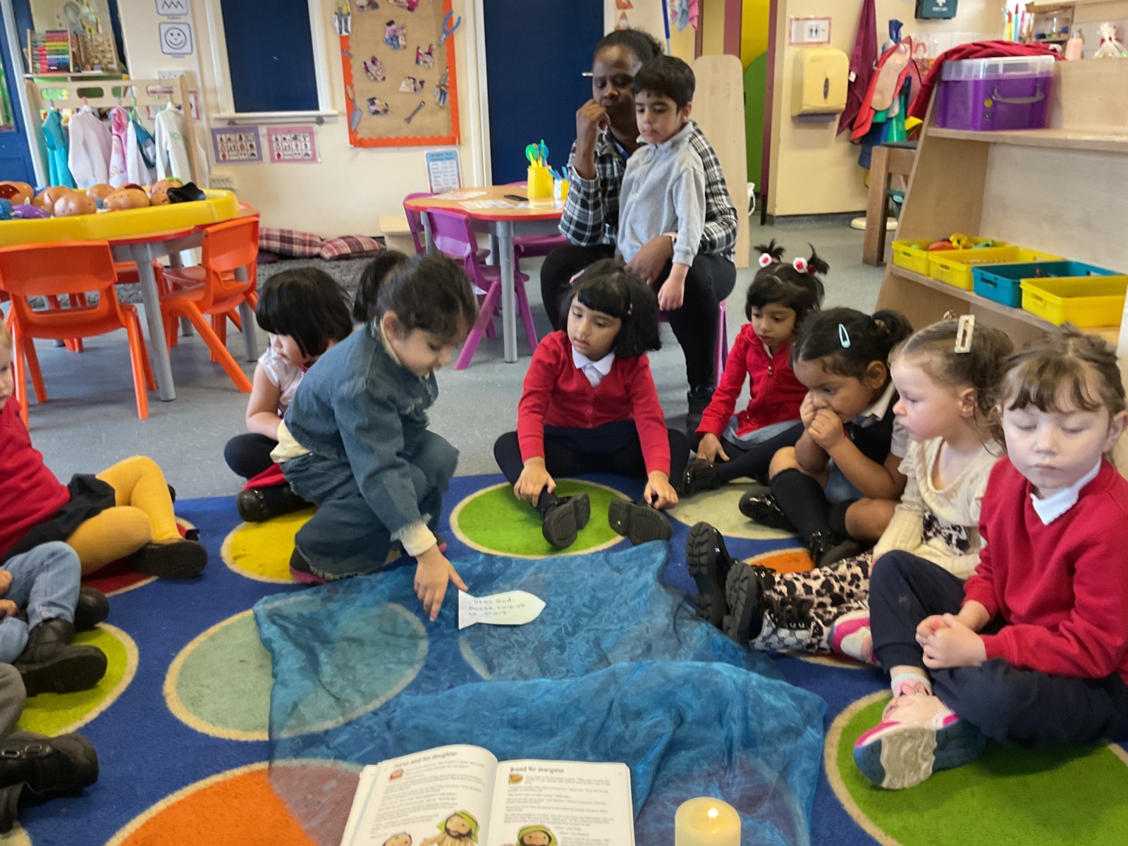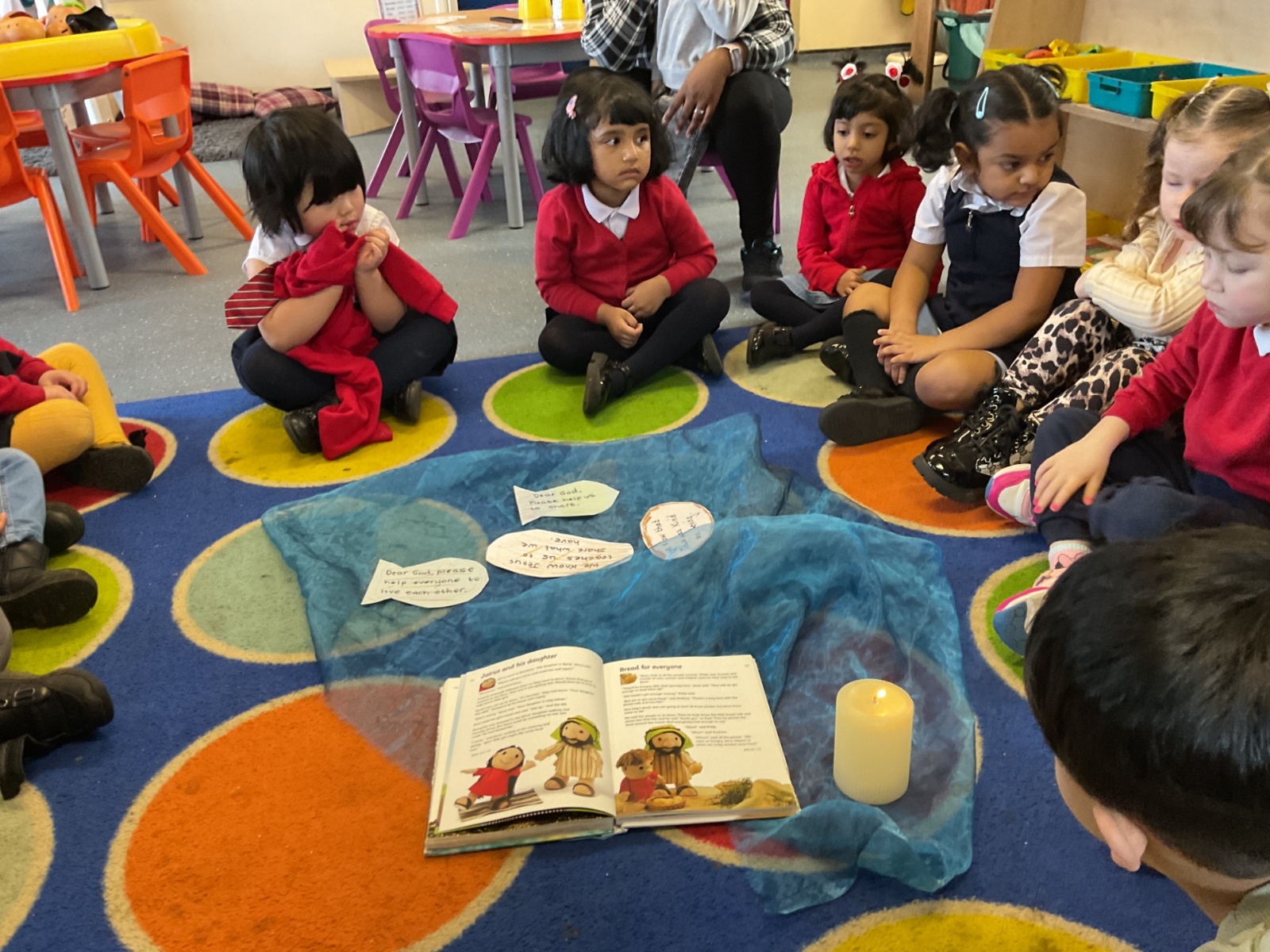 In RE we listened to the story of the 'Feeding of the 5000'. We know that Jesus shared his love with others and that He wants us to share our love with others too. We shared a Liturgy and wrote prayers onto the loaves and fishes.